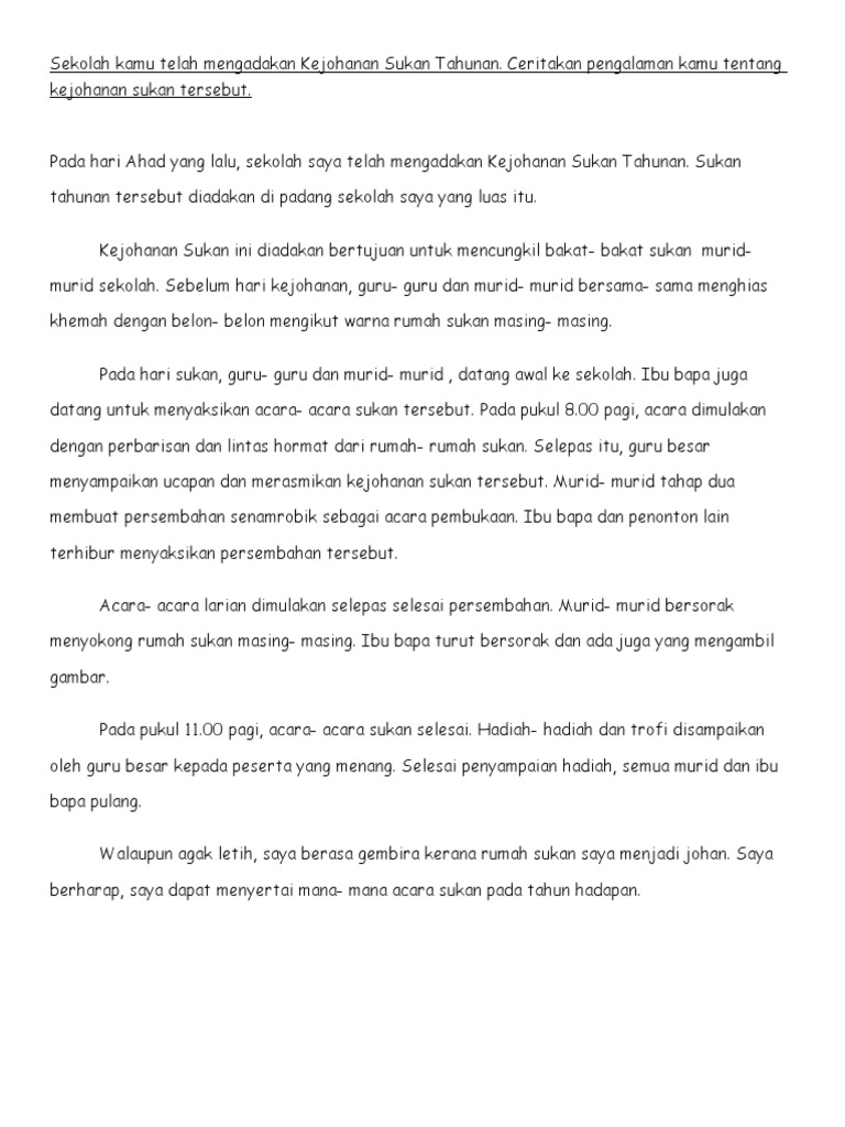 Contoh Karangan Acara Kejohanan Olahraga Tahunan / Catatan Hari Sukan / Download refleksi kejohanan olahraga tahunan.. Hampir sebagian besar pengguna friendster (fs) saat ini berganti dan beralih ke facebook (fb). Andaikan bahawa anda telah terpilih untuk menyampaikan syarahan bagi mewakili kelas anda. Kandungan pada tempe 2.1 protein 2.2 vitamin k 3 contoh pengembangan kerangka karangan. Kebanyakan lebih mengarah kepada sebuah jawaban tentang apa penelitian membuktikan bahwa seseorang yang belajar secara otodidak, tanpa seorang guru yang mengajarkan. Contoh karangan laporan kejohanan temasya sukan tahunan mp3 & mp4.
