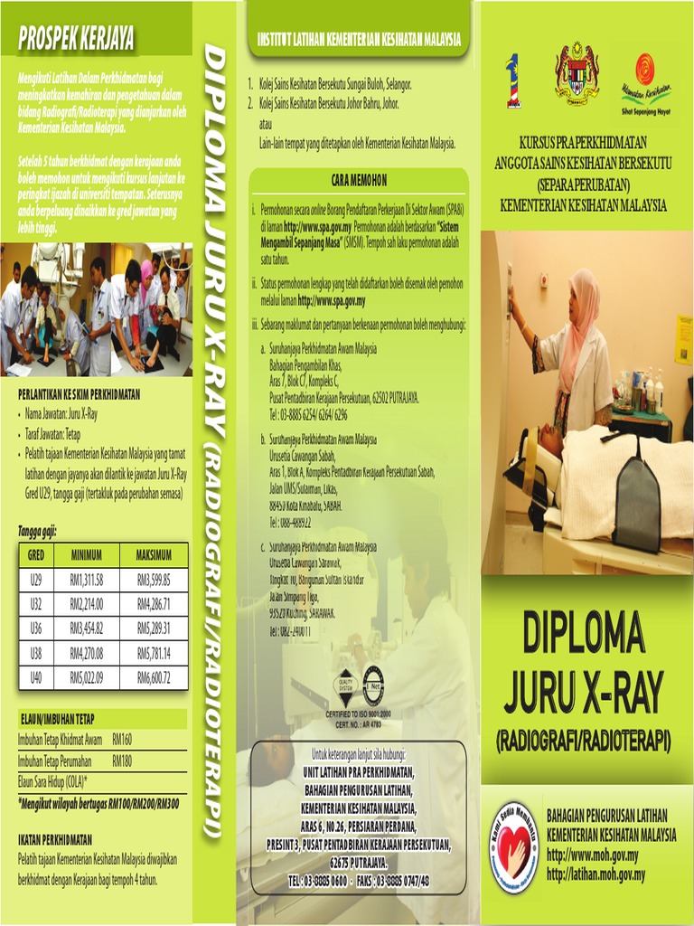 KKM hantar dua JTMP, sembilan juru X-ray ke Sabah - Dr ... from thenusantaradaily.com Jadi, saya pilih jxr sebab saya tidak begitu meminati bidang kerja ma. Lama gila tak post kat sini, berhabuk berkarat dah ni. Ujian yang bakal dijalankan ialah ujian psikometrik yang akan dikendalikan oleh spa. Pengambilan untuk jawatan juru x ray ini kebiasaanya melibatkan calon yang tidak ramai dan juga jawatan yang terhad. So, 1 soalan cuma ada 45 saat untuk memikirkan jawapan untuk 1. Kepada mereka yang berminat, daftarlah dengan kadar segera. Penggunaan sinar x dengan tujuan mengesan kehadiran penyakit dikenali pengimejan diagnostik (radiografi). Pengalaman temuduga latihan separa perubatan: